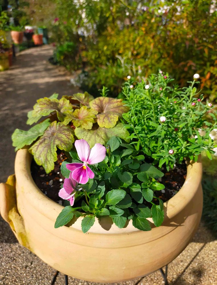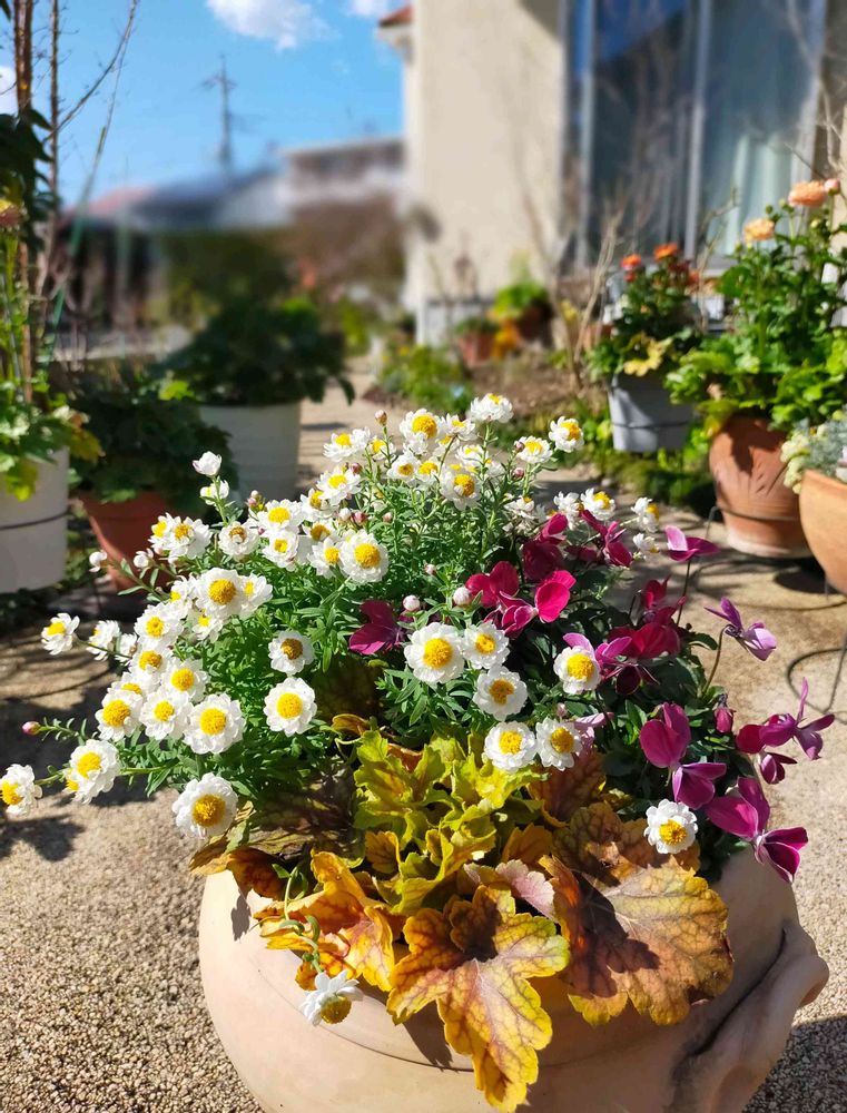 12月初旬に植え付けた寄せ植え、ハナカンザシが満開となり、とっても華やかになっています✨ヒューケラの新芽は、寒い頃とは違う色合いに。ビオラ、セクシークイーンは艶やかに色濃く変化しました💖