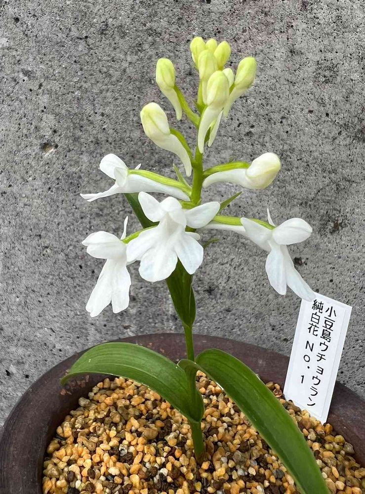 小豆島に産するウチョウランは背丈が小さく纏まりがよく、跳ね上がる側萼片がとても可愛らしいものが多いです。素晴らしい個体も多く発見されているのですが、その多くが無銘で、次第に姿を消していっているようです。