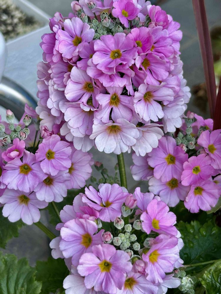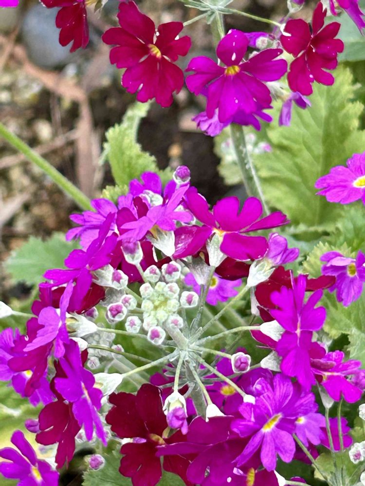プリムラマラコイデスの濃い方の苗を植えて寄せ植えにしたのが、やっと咲き出して来ました🤗