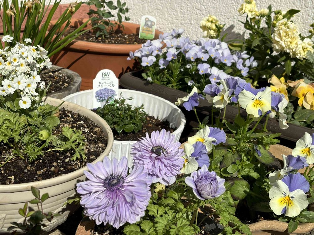 おはようございます☀この週末はガーデニングが捗りましたー😊春の気配がすごいです✨そしてもれなく花粉もすごいです🤧先週、写真真ん中花のまだない苗"カンパニュラ・メリーベル"と、後ろの"丸葉ユーカリ・グニー"をお迎えしました♪