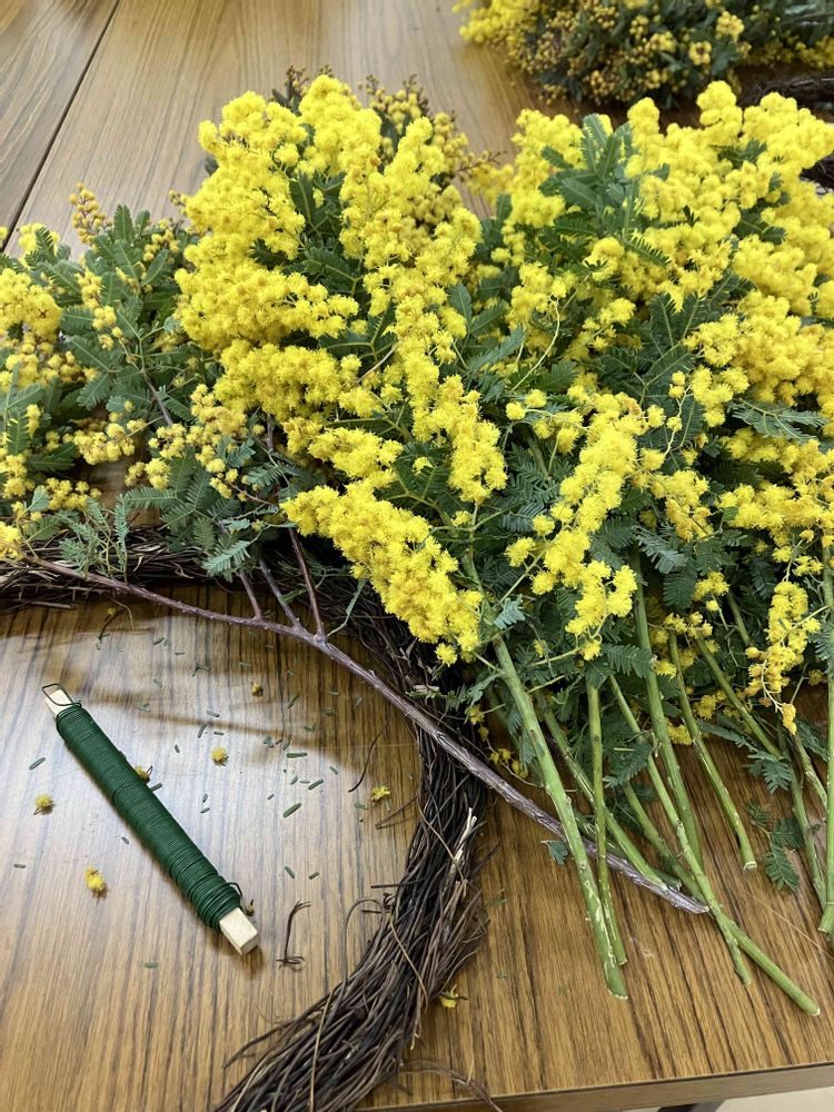 2種類のミモザを使って、切り離した花を3つずつワイヤーでクルクル回して、とめながらぐるっと1周して出来上がりました🌼🌼🌼