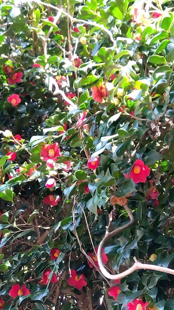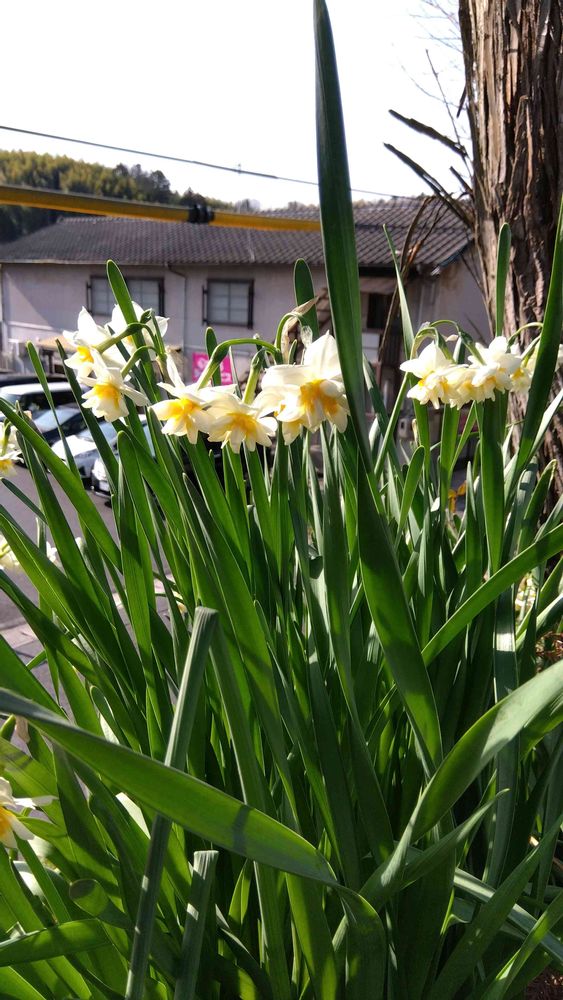 八重のスイセン、ツバキはかなり散っていましたがまだまだ沢山、白いツバキ、そろそろ終わり?