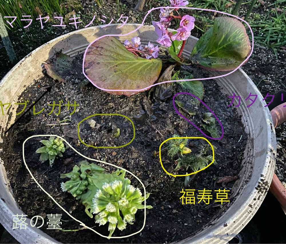 追記:後日よくみたらカタクリかと思ったのはホトトギスの様です。カタクリも蕾の付いた物が植っていましたが、そこのは残すとの事でした。