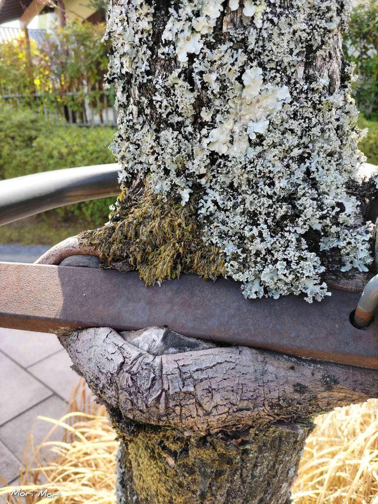 歩道の楠木 杭がくい込んで地衣類や苔でいっぱいです。