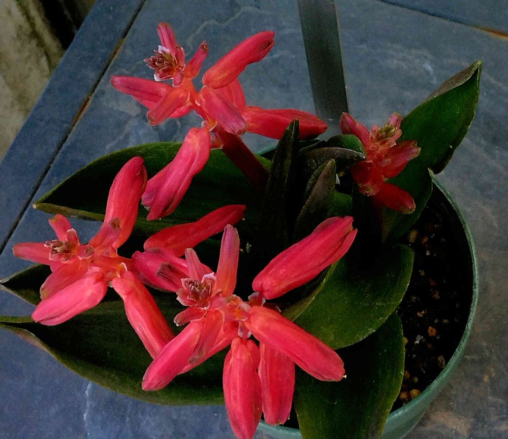 12~1月ごろ、花茎を伸ばして総状花序をつけ、朱色の筒状花を咲かせる。