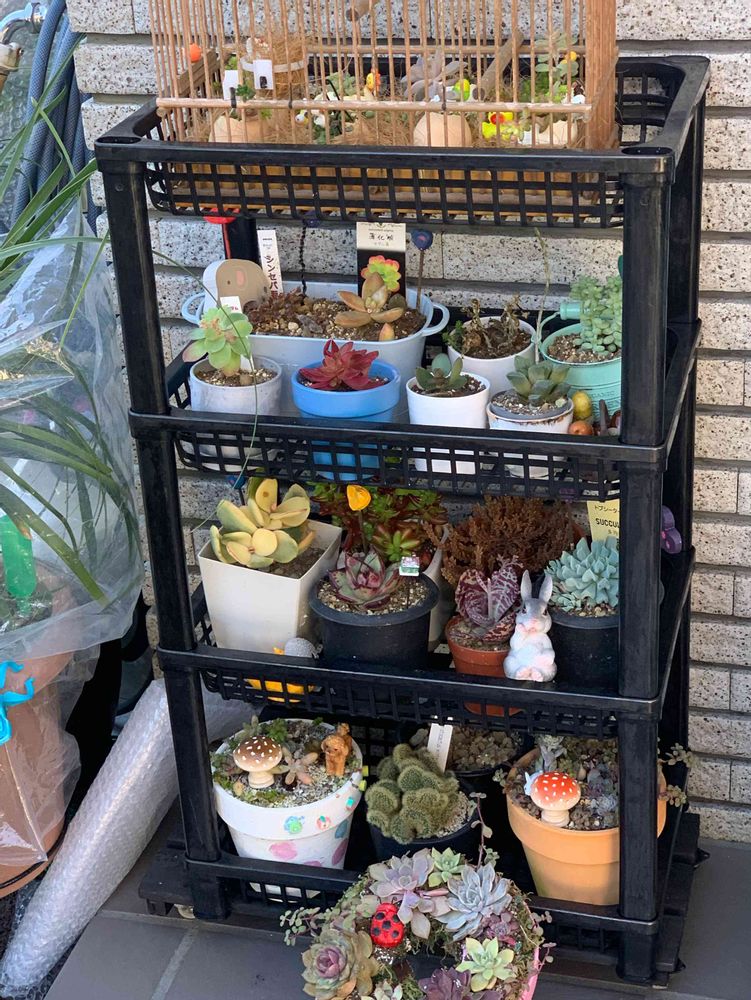 彼女の玄関先には、可愛い多肉が、軽石や石、旦那さんが昔メジロを飼っていたから鳥かごなどに植え付けられていました。