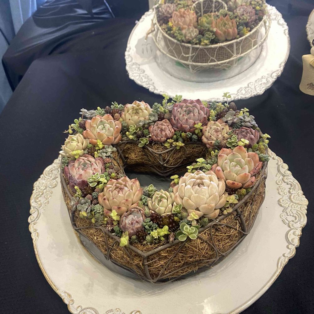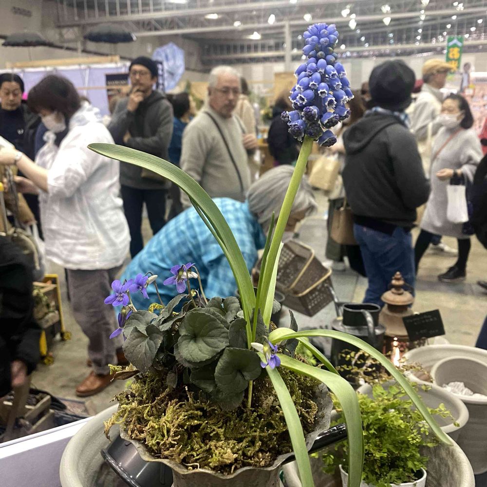 ムスカリと野趣あるスミレの苔玉寄せ植えがオシャレでした💙