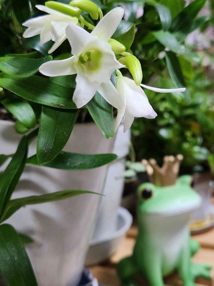 こんばんは、可愛いお花が咲いてます🤍🤍🤍💕白いお花は素敵ですね。窓辺が華やかになりましたね。カエルさんも可愛いですね(◍•ᴗ•◍)❤💕💕
