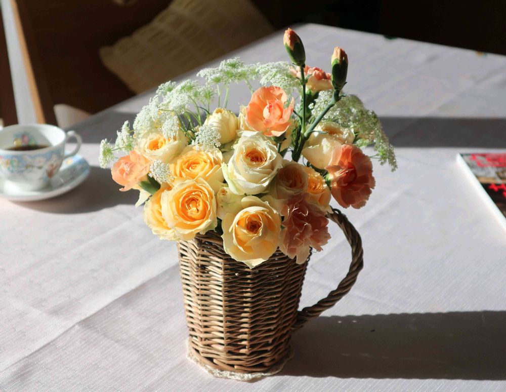 いつものすえちゃんらしい花の飾り方でウットリしてます、淡い色のスプレーバラが春らしい気持ちにしてくれますよ、それにしても可愛い柄のコーヒーカップだね😊🥰