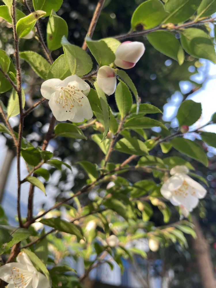 おはよう☀長〜い時間をかけて、やっと咲き揃いだしました🎶数年前の植木祭りでのプレゼント品です。別名「香り椿」らしいですが、、、香ってるかな???小さな花がとても可愛らしいです(^^)