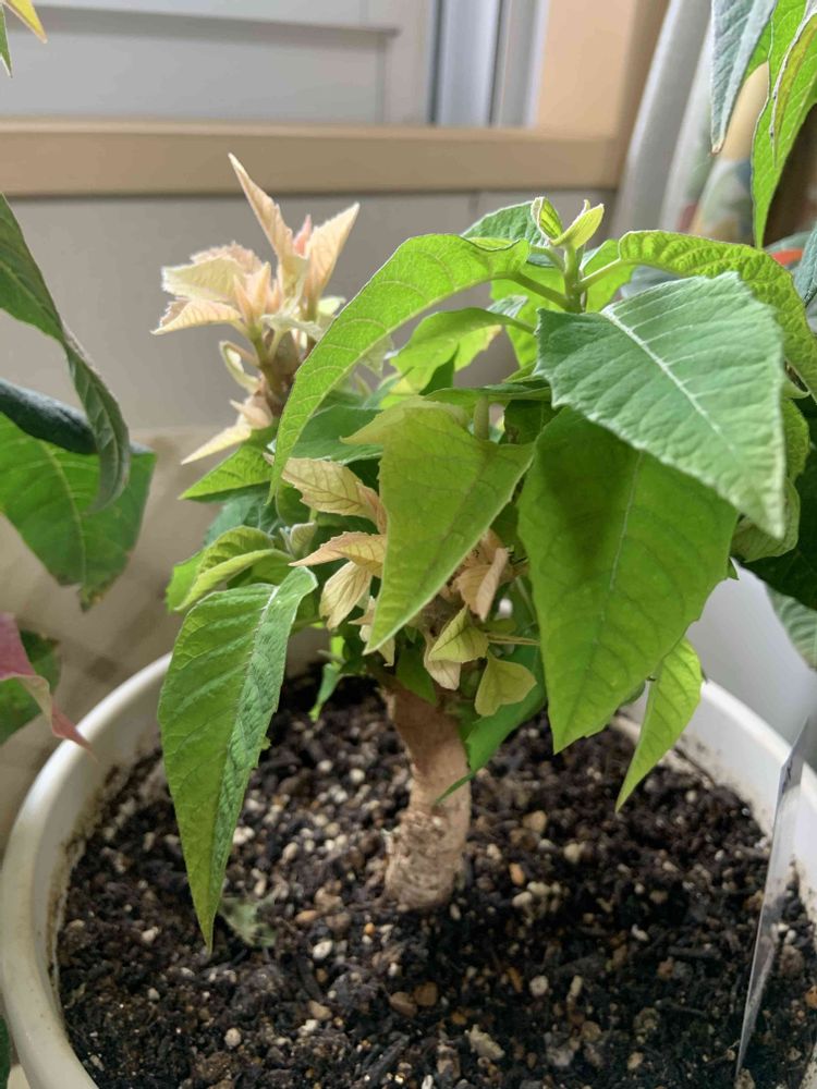① ピンクの包はほとんど落ちましたが、その上から緑の葉っぱがワサワサ伸びたかと思ったら、短日処理をしたかのように、色付いています。