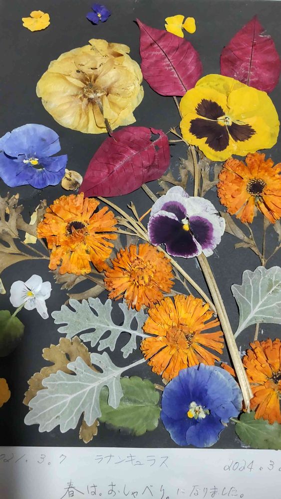 古いラナンキュラスだけの、押し花に、新しい、花を、足して、みました❗️🤗赤い葉っぱは、まだ咲いてた、ポインセチア❤️