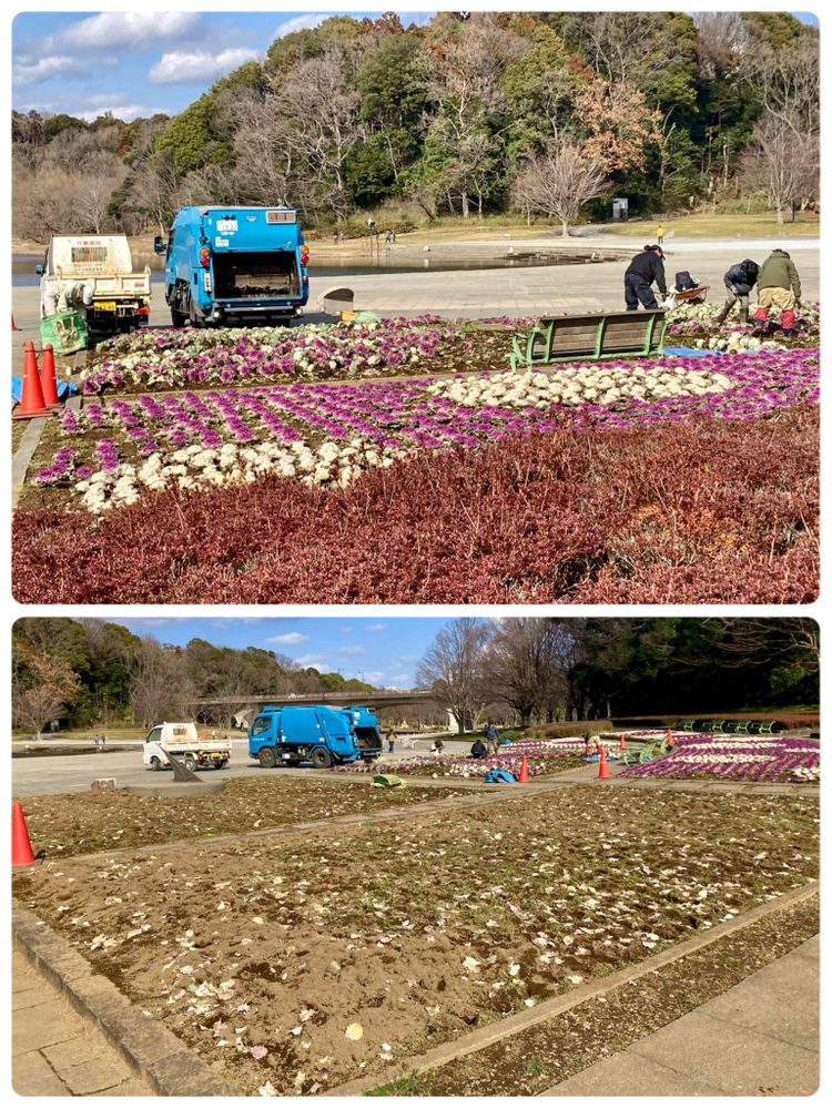 さんへ 未だ綺麗なのに全部抜いちゃうんです。 ベゴニアの時には山積みの中から好きなだけ貰えたのですが、今回は花では無いので、ごみ収集車へ投げ込んでました。 葉牡丹でもいいから欲しかったです。