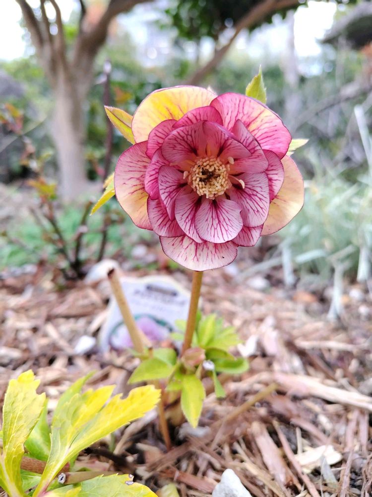 小苗でお迎えして2年目のクリスマスローズ、"ダブル・ゴールドネオンシェード"初開花で〜す🎉✨✨✨