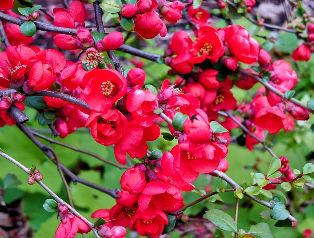 朝通勤時に見かけたボケ。赤色が鮮やかでした。