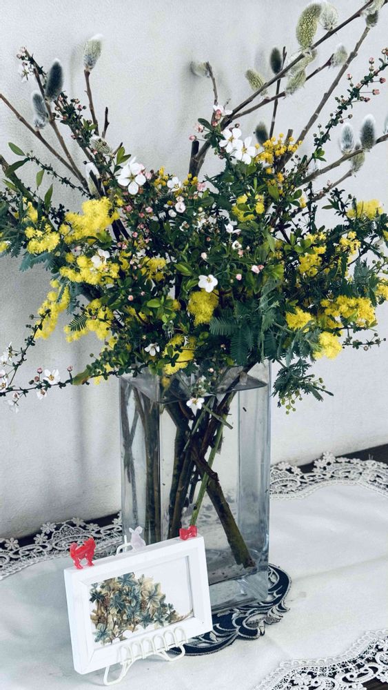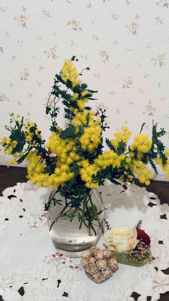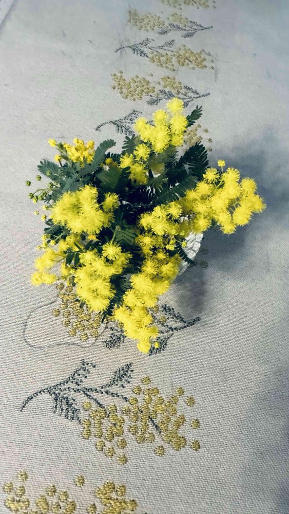 ミモザにユキヤナギかな!?の小花が効いていますね。美しさをより引き立てています。小物や刺繍とのコラボも素敵✨