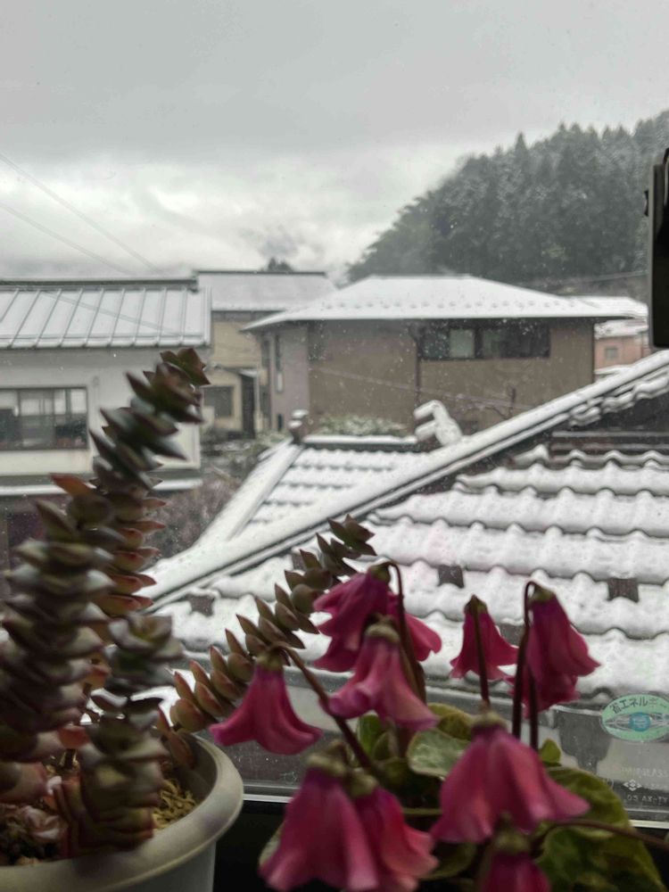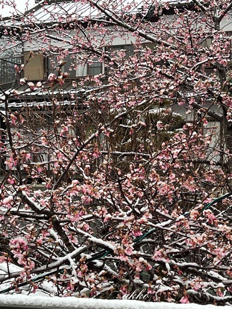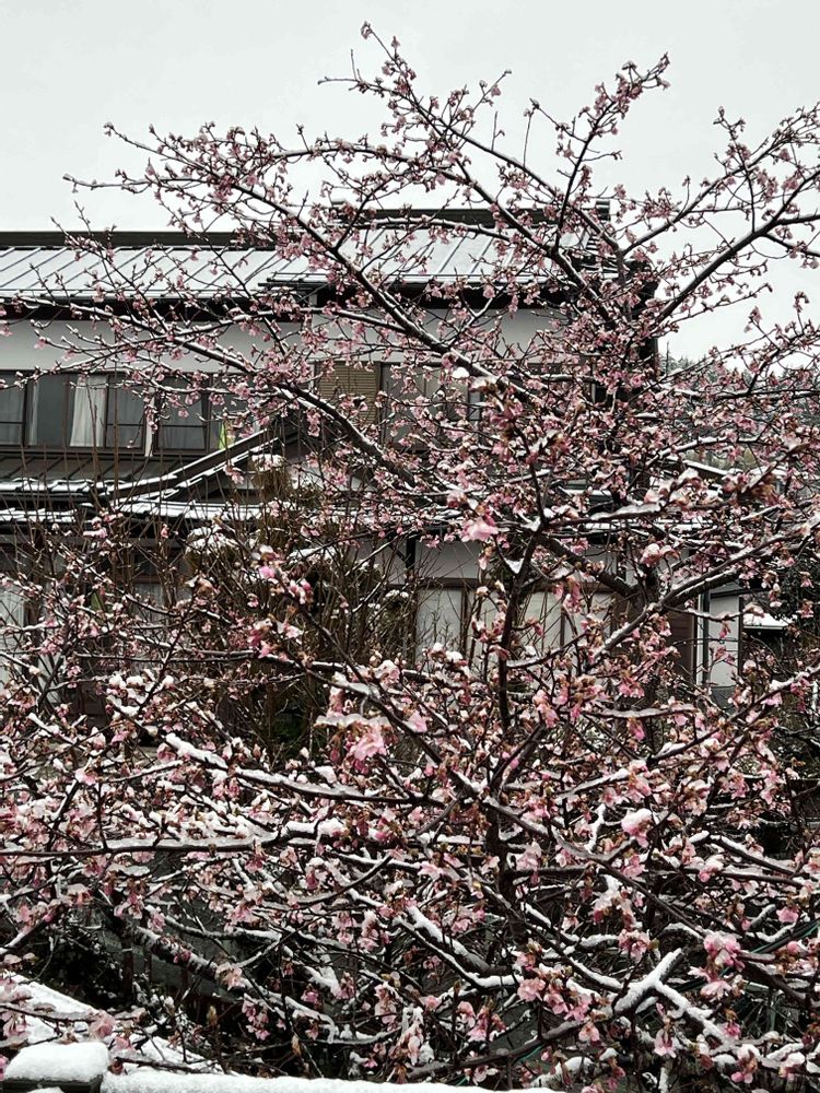 今朝は起きてびっくり‼️満開の河津桜に雪