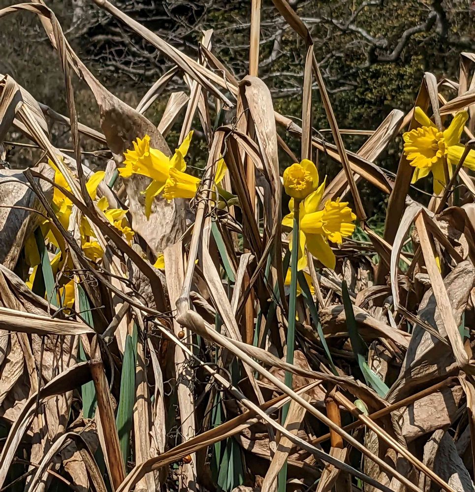 ③枯れたカンナの中で背伸びするラッパズイセン 頑張ってね