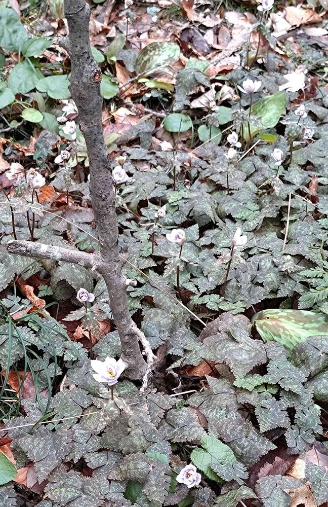 キンポウゲ科イチリンソウ属の多年草。山地の渓谷沿いや、山麓の樹林内、竹林などに生える。根茎は太く横に這い、紫色を帯びる。根生葉は3小葉で、小葉は三角状卵形で鋸歯がある。表面は濃緑色に白斑が入り、秋に地上に出て冬を越すためか、春は汚れたような淡褐色を帯びることが多い。裏面は紫色を帯びる。一見したところ、セリ科のミツバにそっくりの形をしている。花期は3~4月。茎葉は茎頂に3個輪生し、その中心から花柄を立て、菊の花に似た直径3〜3.5㎝の花を上向きに開く。花弁状の萼片は線状長楕円形で10〜20個、白色〜淡紅紫色などがある。雄しべと雌しべは多数。葯は黄色。普通2月頃から花が咲きだすが、日だまりでは1月に花を見ることもある。