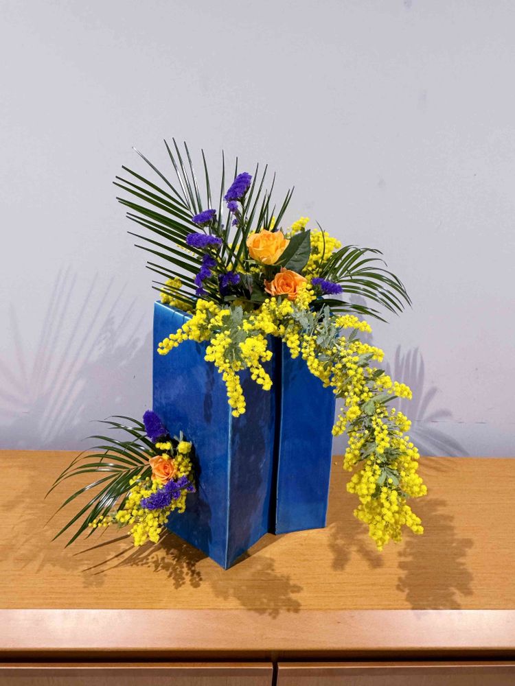 黄色🟡のミモザがトルコ色🔵の焼物花器に映えて綺麗。(自画自賛⁈)