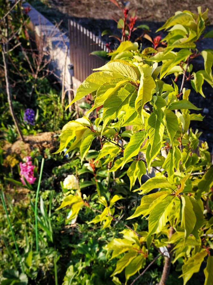 風が相変わらず強すぎて、水と芽出し肥だけ撒いてギブ。葉桜が綺麗です。桃ボナンザピーチ順調に大きくなってたくさん咲いてくれてます。今年もちょっとは食べられるかなー。冬も一切葉を落とさなかったバラさん、さっさと新芽が展開してます。他のバラも新芽が展開してますがツヤッツヤで綺麗ですわ。