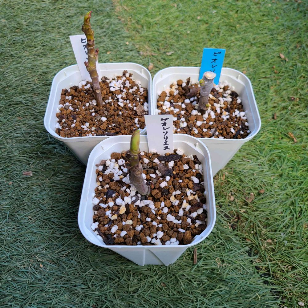 いちじくのビオレソリエスの挿し木です。水に1週間部屋の中で挿していたら芽が動き始めてしまいました。根は出てないけど土に挿し外管理します。