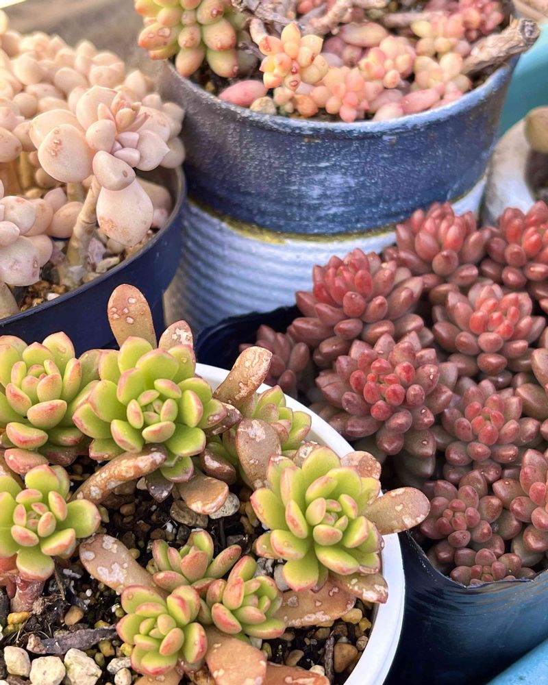 紅く紅葉してるのがホワイトストーンクロプ。丈夫な多肉なので色んな鉢に移植して増やしてます😄