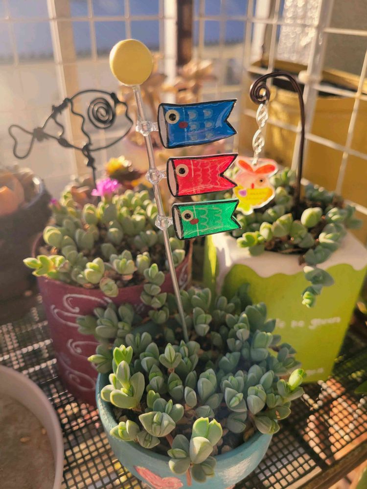 吹き流しの色は、青(木)、赤(火)、黃(土)、白(金)、黒(水)の5色で、魔除けの意味があるらしい。お父さんが黒、お母さんが赤、子供が青。