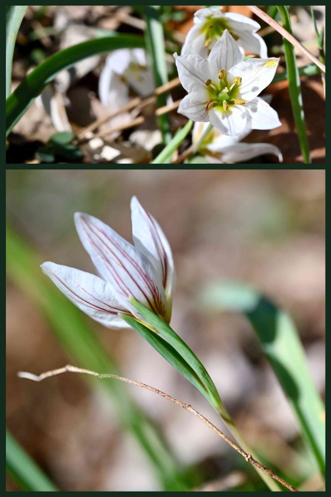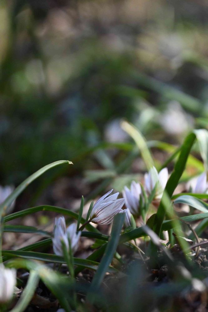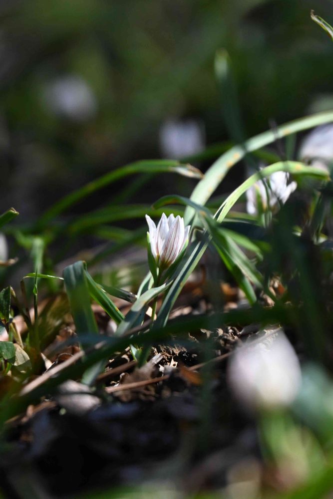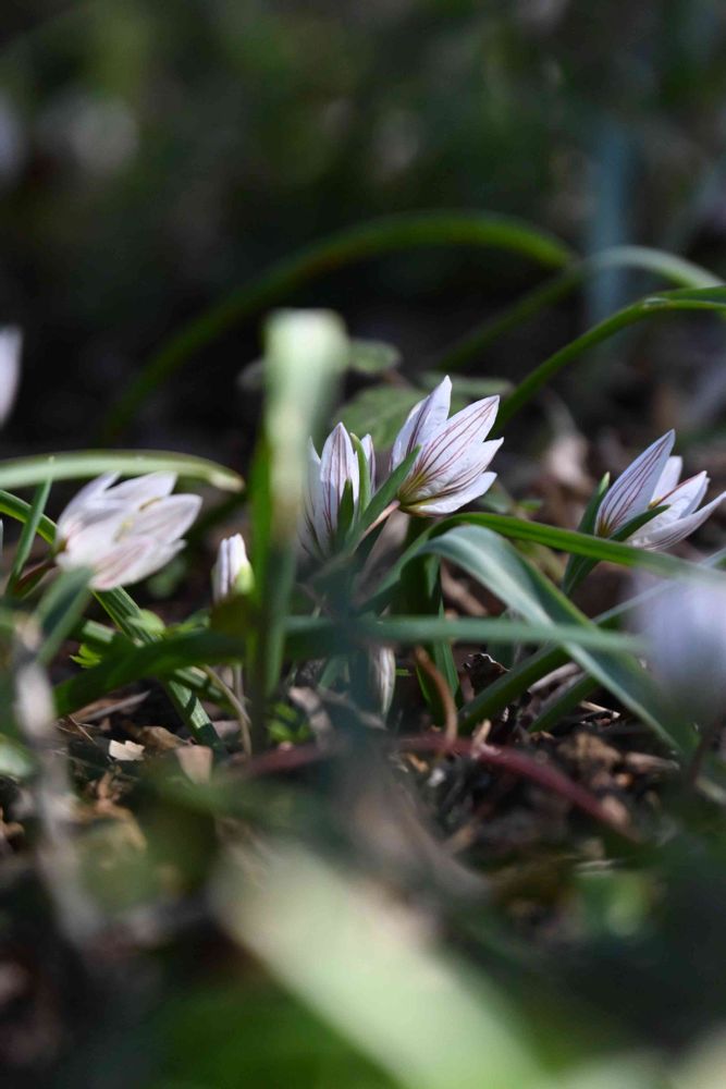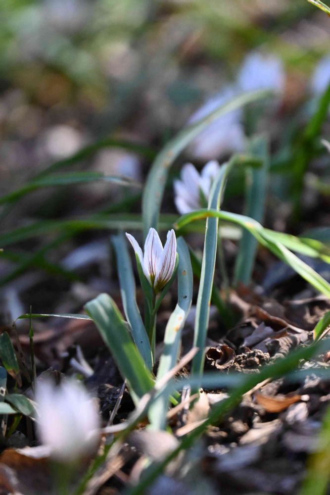この葉の間から早春に15cm程の花茎を立て、その先端に白い花を一つだけつける。花の少し下には一対の苞があり、小さな葉状で緑色をしている。