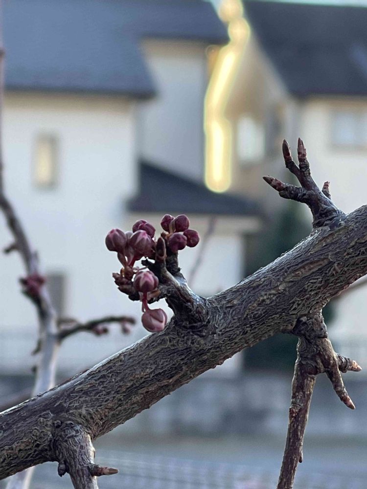 ➊ 出発前に庭場の確認がてらパチリ!です♪ 2/25に“花芽だよねー”って投稿してました発芽スモモの同じ枝です! ガクが割れて来て さぁー いよいよですねー❣️
