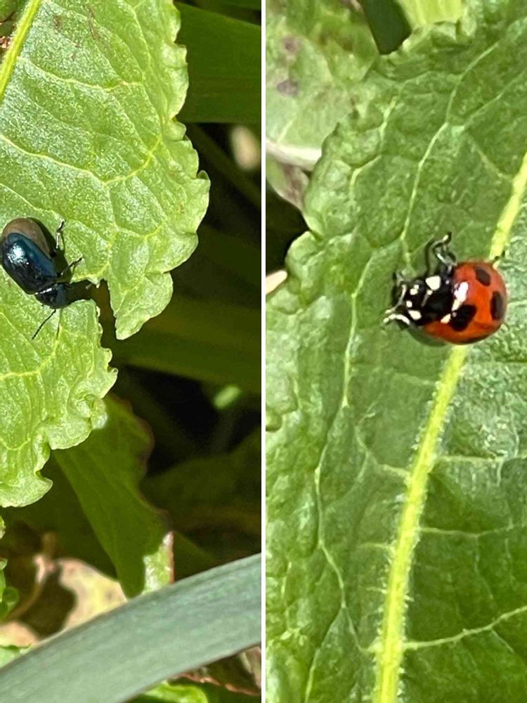 ➌ 川原の陽だまりではコガネムシの仲間と思われるちーちゃな子がせっせとお食事中でした♪てんとう虫君も🐞同じ🌱っぱについていましたがこの子はナナホシテントウなので🌱っぱではなくそこへ飛んでくるもっと小さな虫を待っていたのかもしれません⁉︎