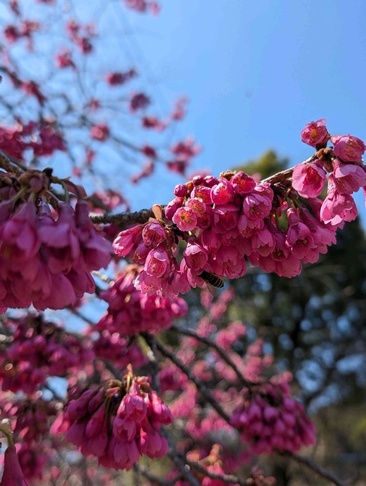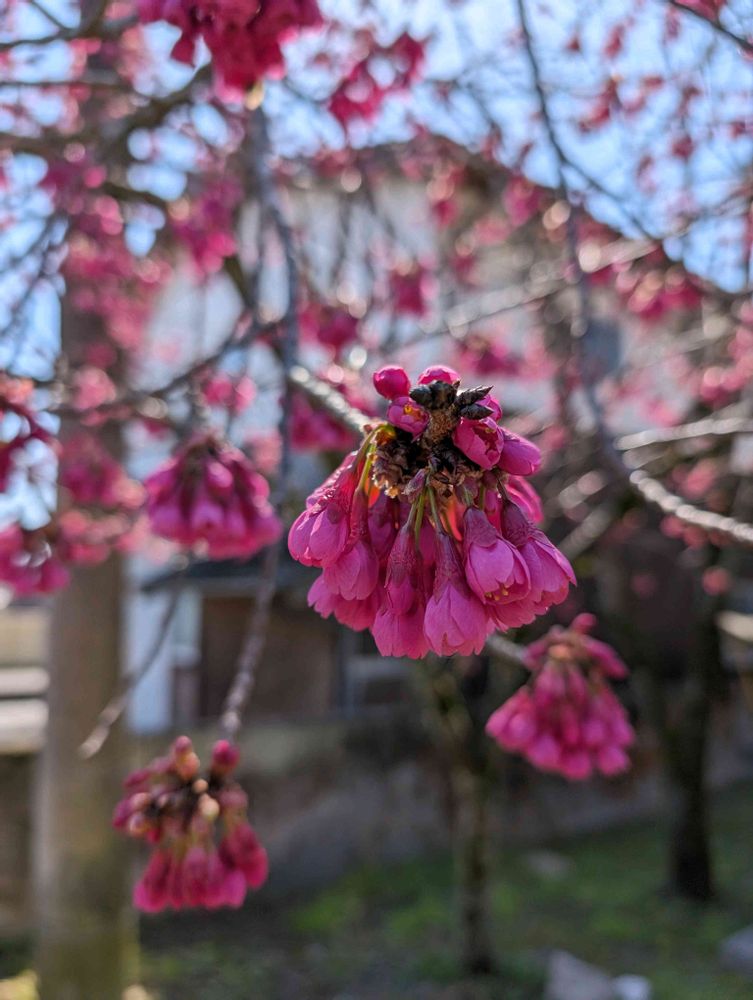 お寺さんの向かいにある神社に緋寒桜が咲き乱れ、蜜蜂がせっせと飛び交ってました。