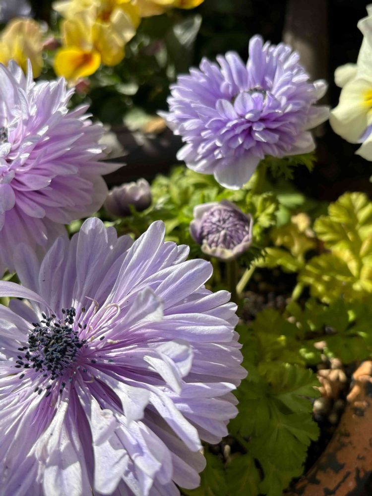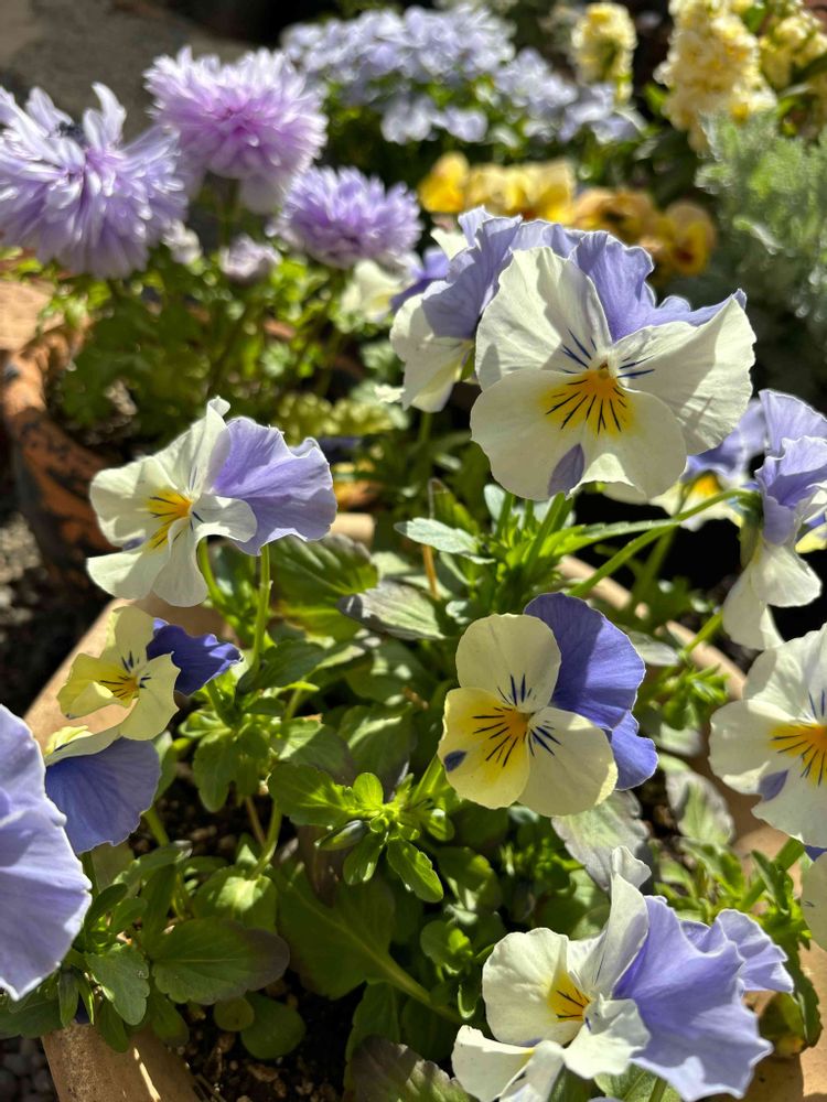 ガーデニング日和でした✨☺️宿根草をだいぶ植えたけど、花はないので、写真はとても元気なパンジーマリアブルーオーシャンと八重咲きアネモネ