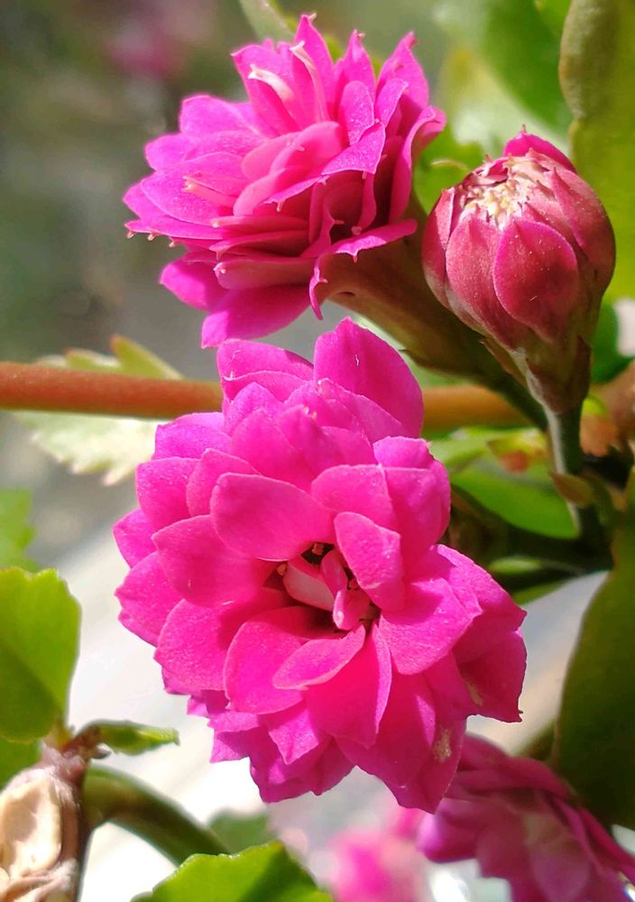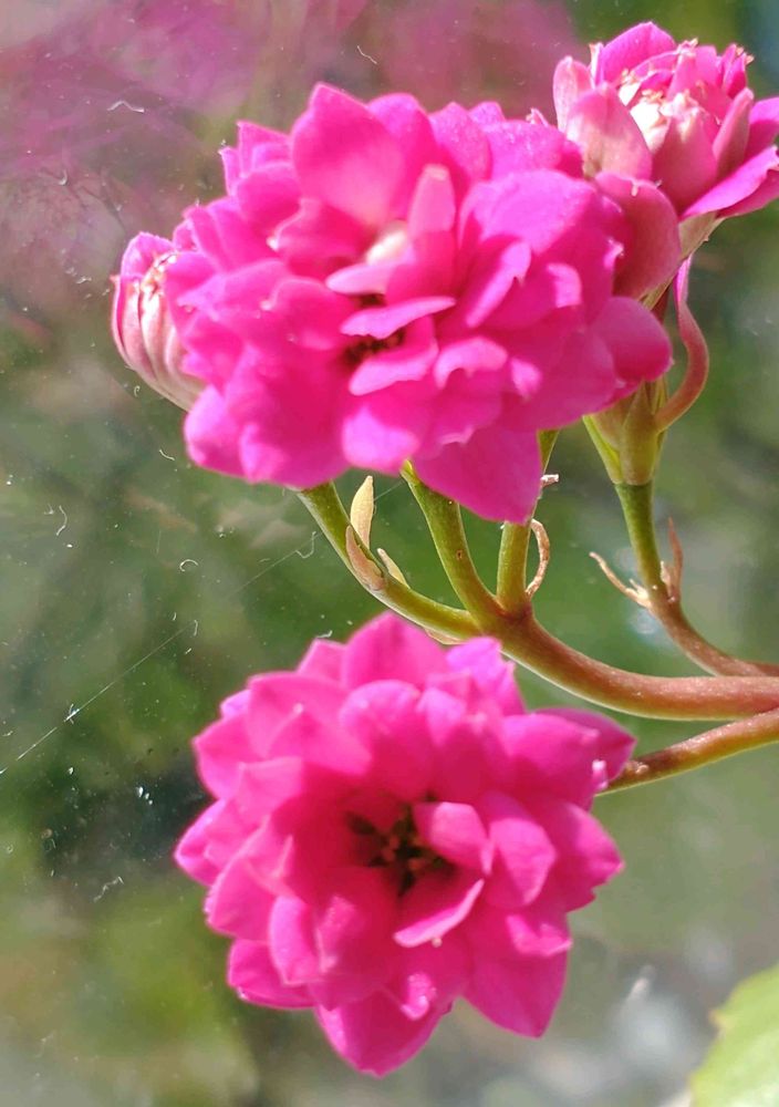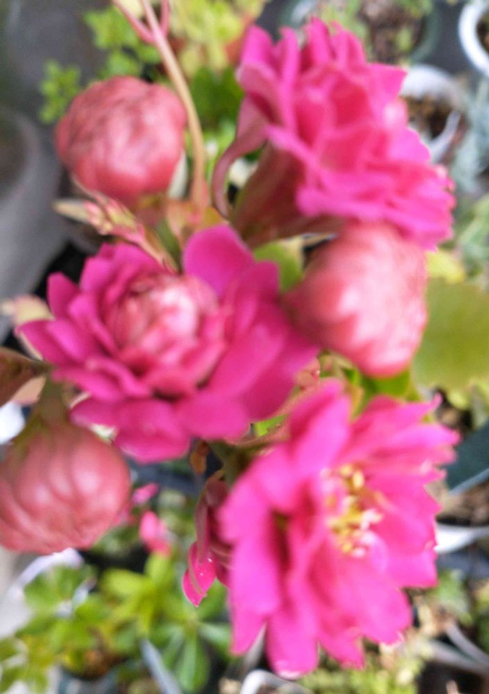 カランコエ・グランディーバフォスター(ベンケイソウ科カランコエ属)濃いピンクのバラ咲き八重、蕾がなかなか開かないし、花茎が間延びしてるから カットして窓辺に飾れば〜