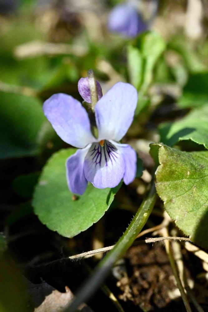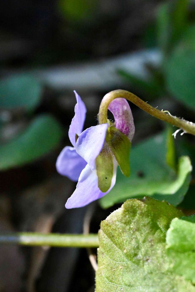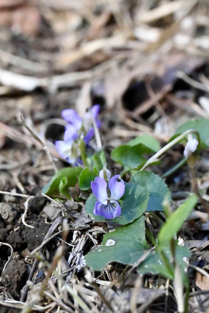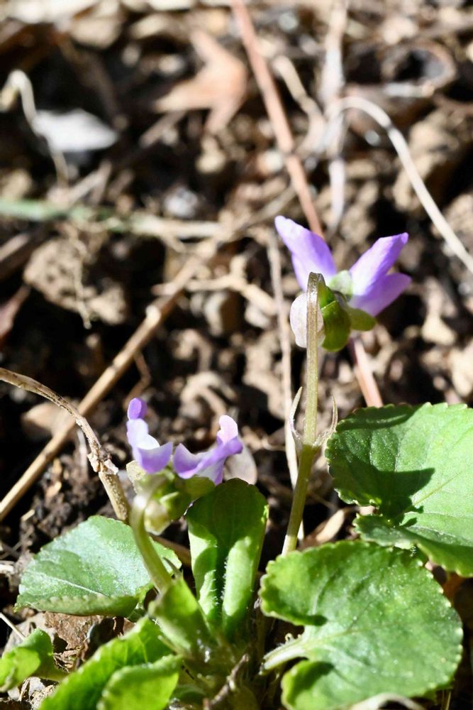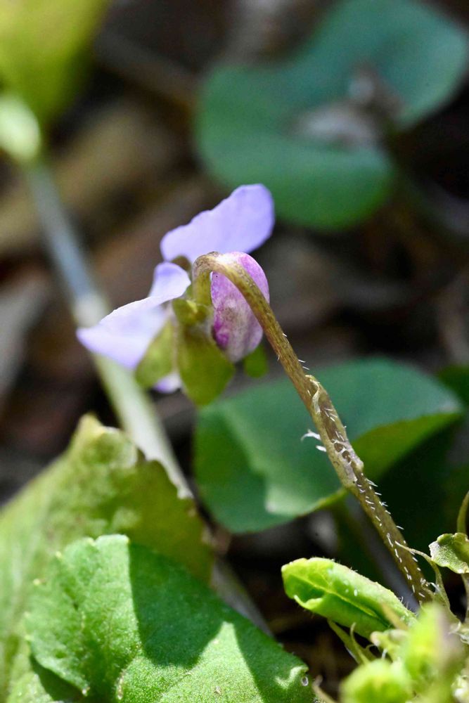 💜スミレの仲間の中では最も開花が早く、葉はフタバアオイのように丸く、両面に毛が生えているのが特徴。