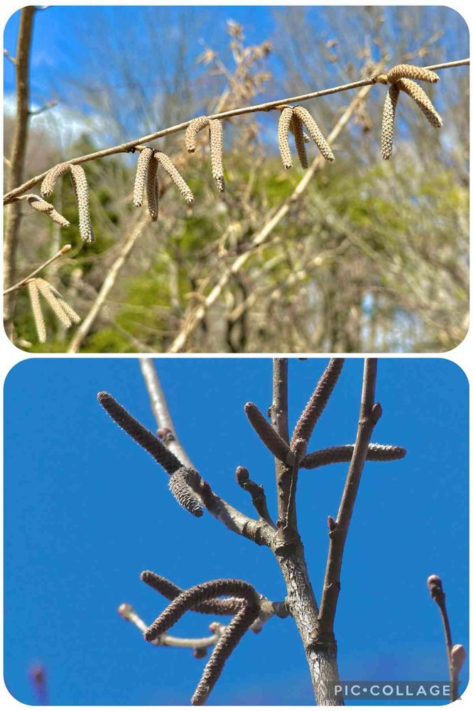 可愛く枝からぶら下がっているのは、ツノハシバミの雄花花序です。ハシバミの仲間は雌雄同株なので、そろそろ雌花が咲いてもいいんですが⬇️を見るとまだ蕾ですねえ。
