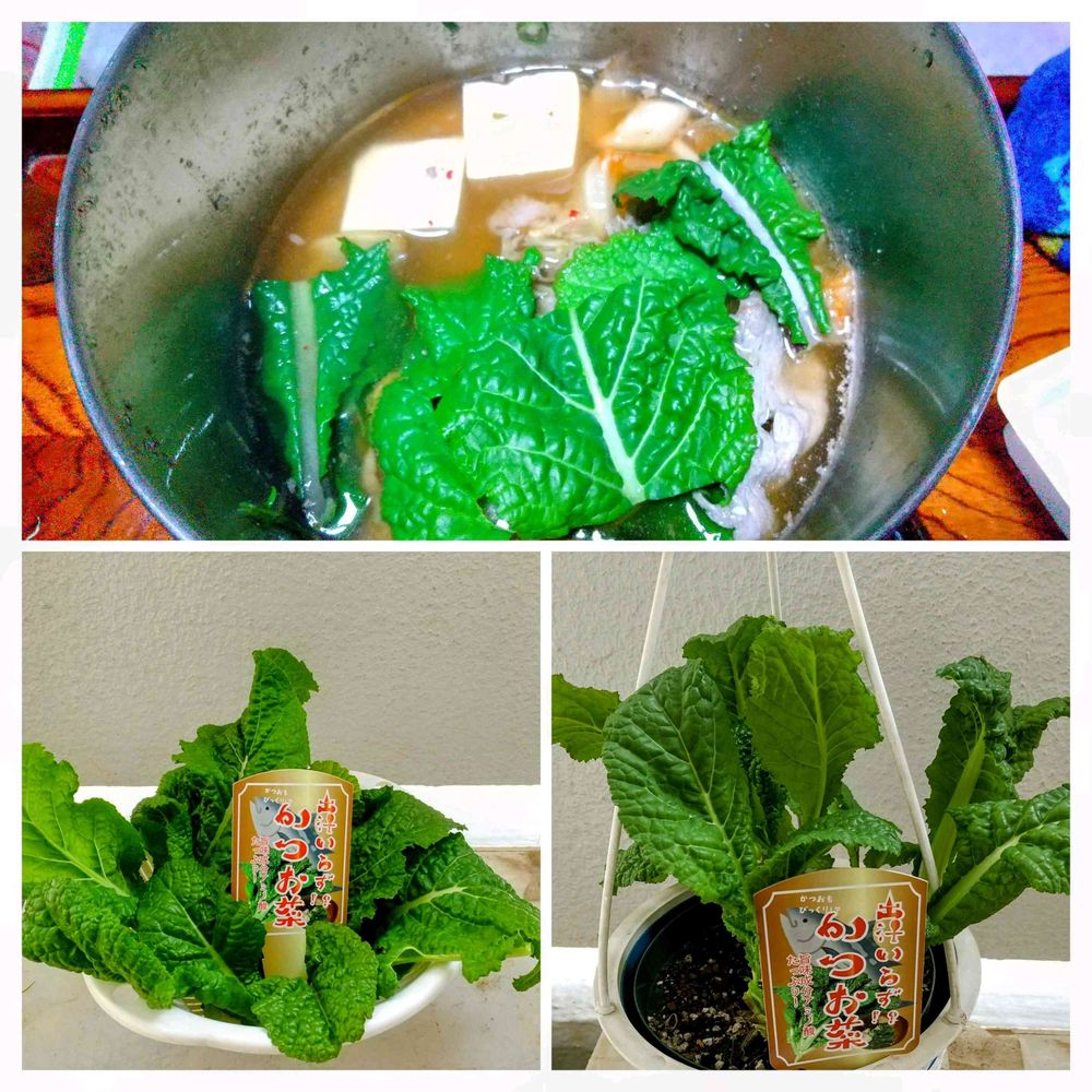 あんまり癖がなく、サニーレタスのように外葉をちぎって何度も収穫できるので、かつお菜重宝しています