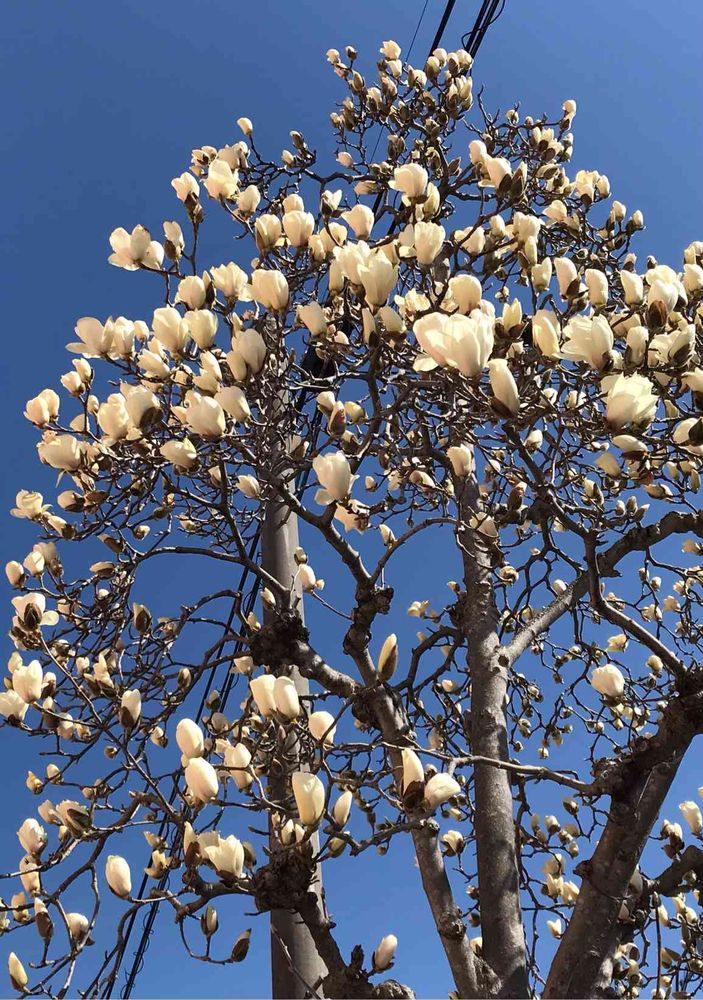 駅通りに植えてある、ハクレンの街路樹が、咲き始めました。お花のリレーが始まります。次はソメイヨシノです。