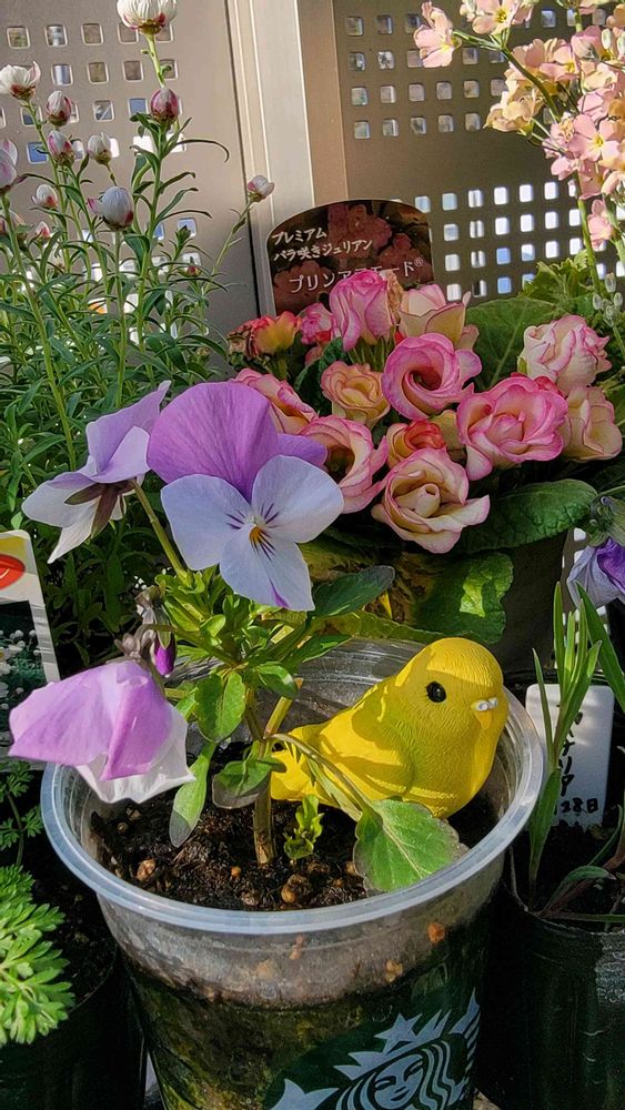 可愛い小鳥のガーデニング雑貨を見つけたので、ビオラの横でゆっくりしてもらってます(*´艸`)🐦