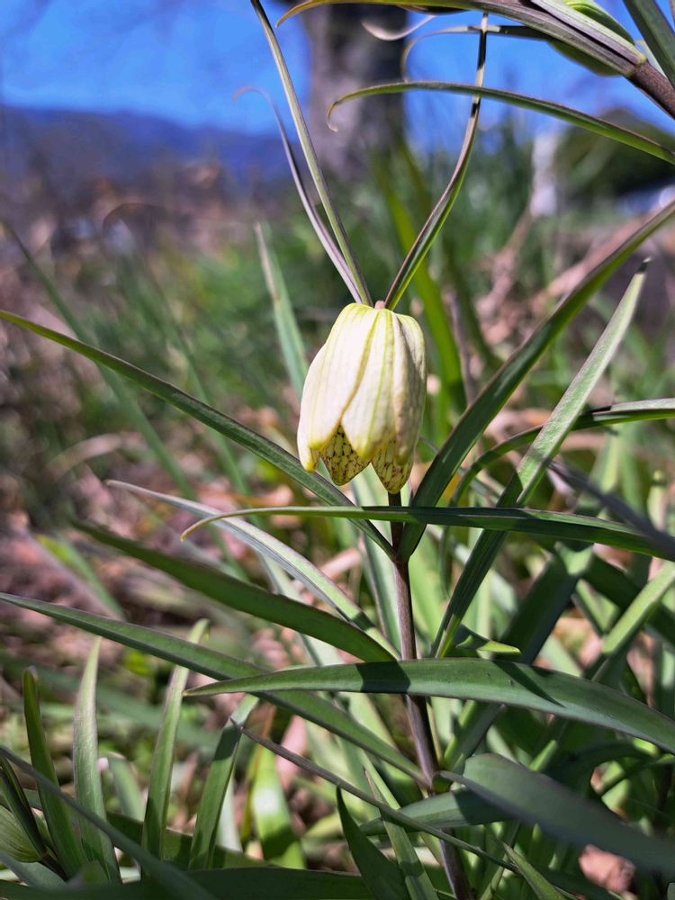 以前紹介した水仙が咲いている河原には、アミガサユリやアルストロメリア等が生えていますが綺麗なので採って行く人がおり、アミガサユリも花が付いている株はこの小さな株しかありません。