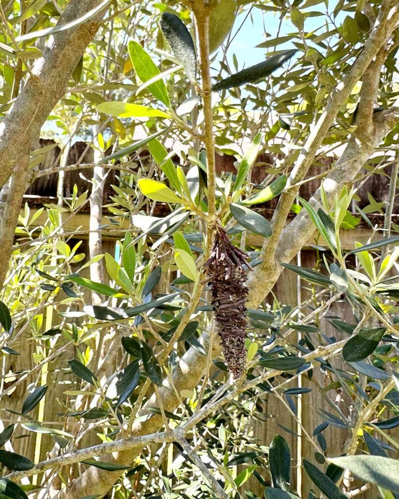 花ではないですが、庭のオリーブの木にミノムシがぶら下がってました😆