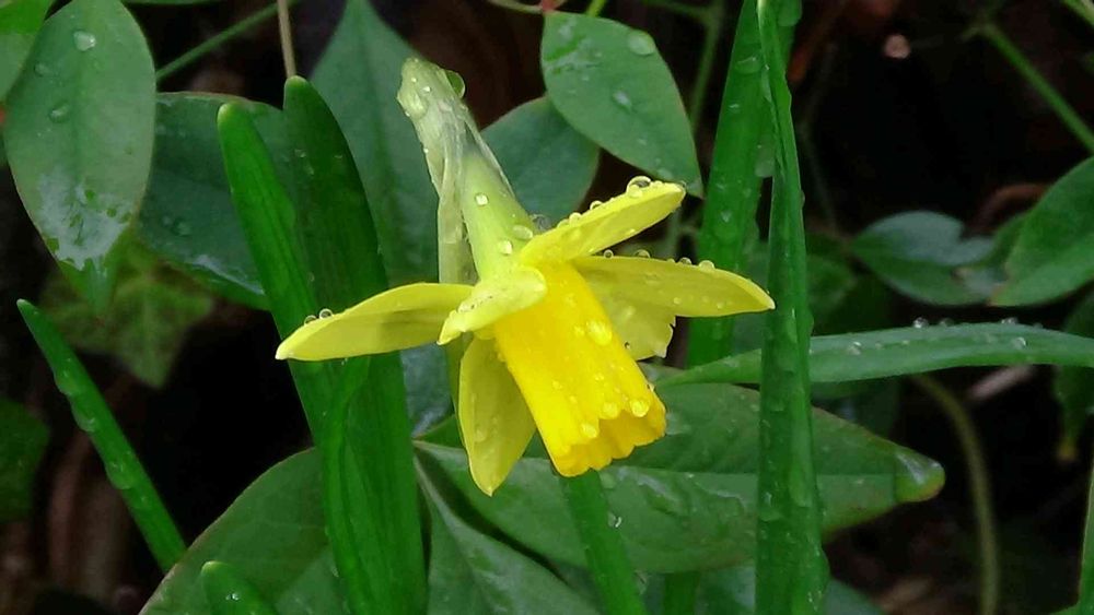 小さな庭のミニラッパスイセンが黄色く咲きだしました。