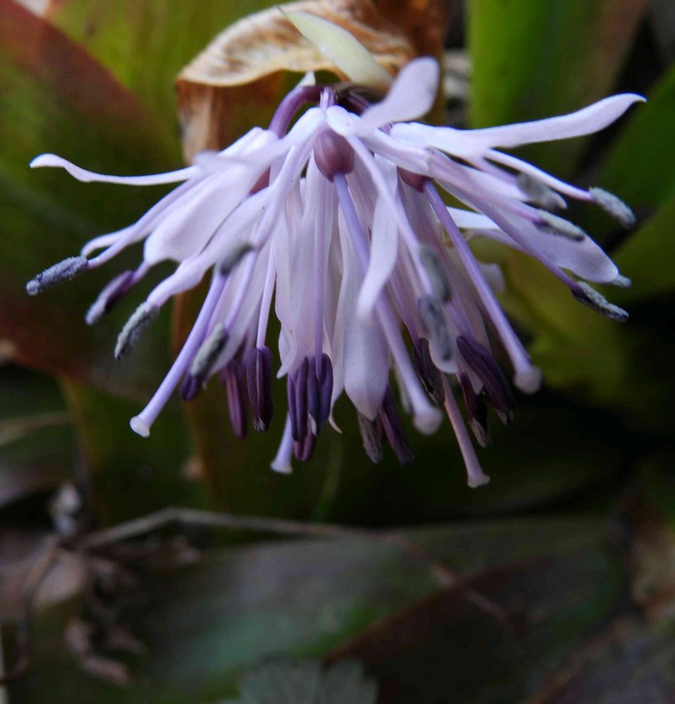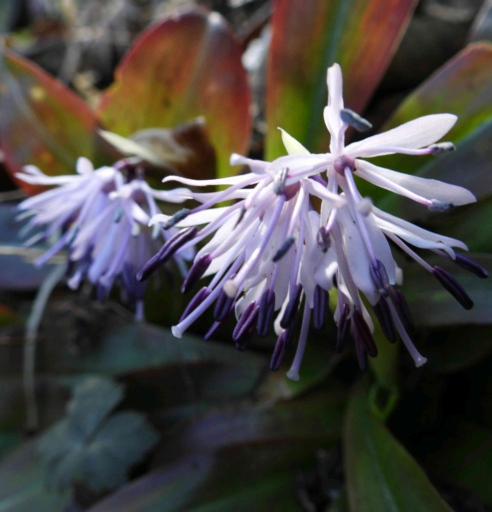 白いショウジョウバカマの花、長い蕊と濃い紫色の葯がとても美しいです💜🌿