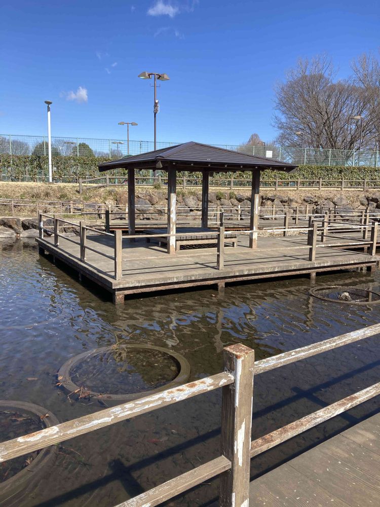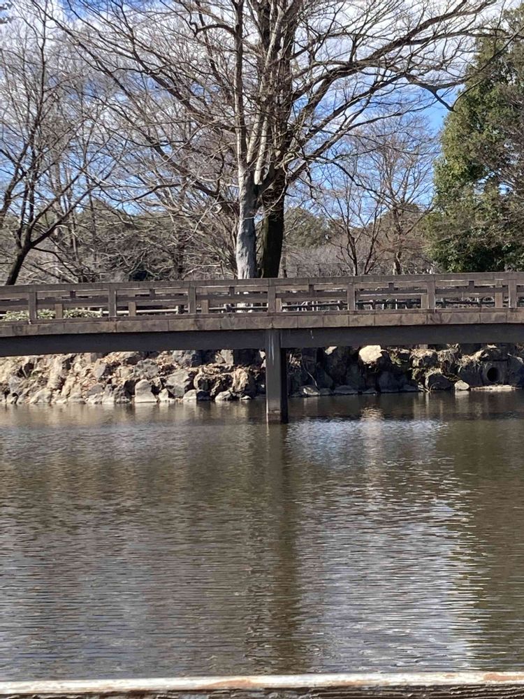 公園の池に架かる橋の向こう側に
