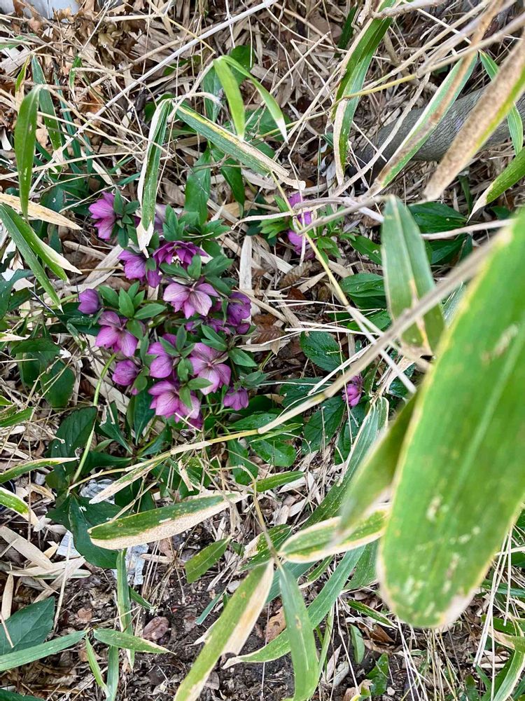 毎年お見せしているのですが胸の高さぐらいに生い茂る笹の中でクリスマスローズは健気に生き延びています。枯れるまではいかないのですがやはり育ちは悪いようです。
