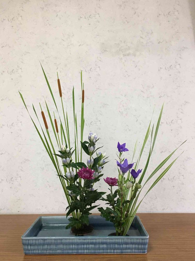 今回の花材、ガマ、リンドウ、桔梗、菊