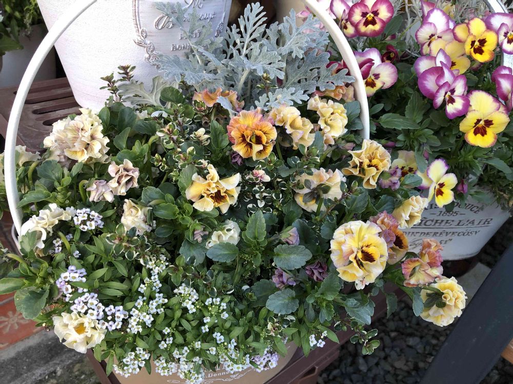 何度か投稿した花苗うえたさんのフリル咲きパンジーを使った寄せ植えです。