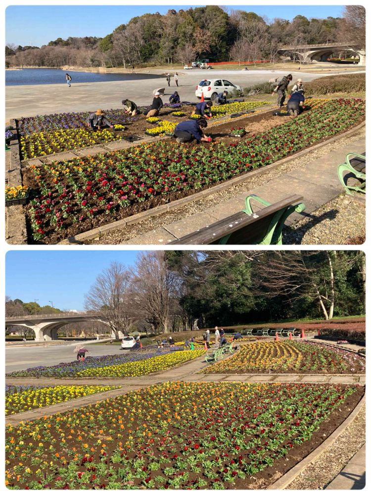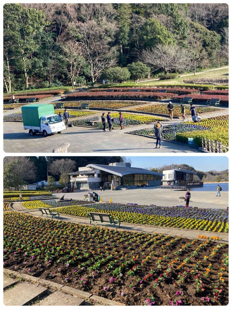 "21世紀の森と広場"のパークセンター前の花壇にようやく「ハボタン」に代わって「パンジー」が植えられた。 菜の花と水仙は依然として綺麗に咲いているが、河津桜は葉桜になってしまった。