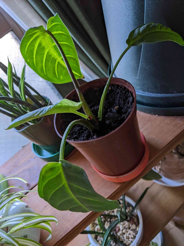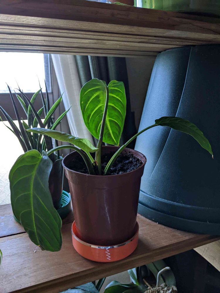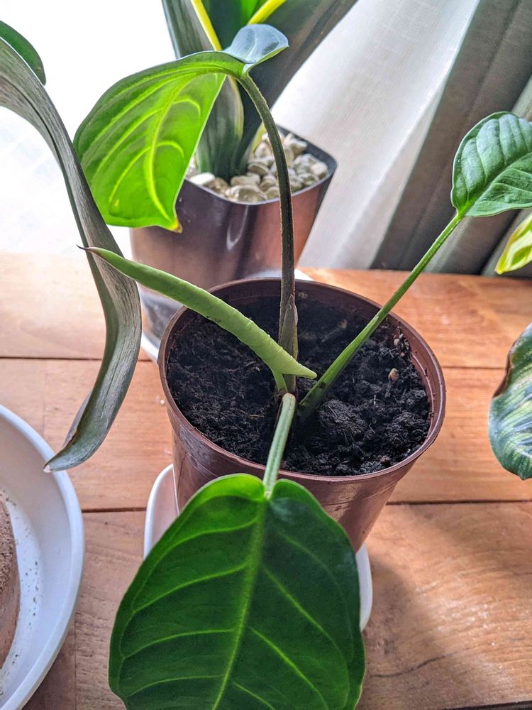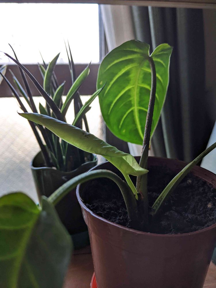 このキサントソーマは買った当初から濡れている土がまったく乾かないので心配です。すでに展開している葉も、実はじわじわと葉先が茶色くなっていっています。