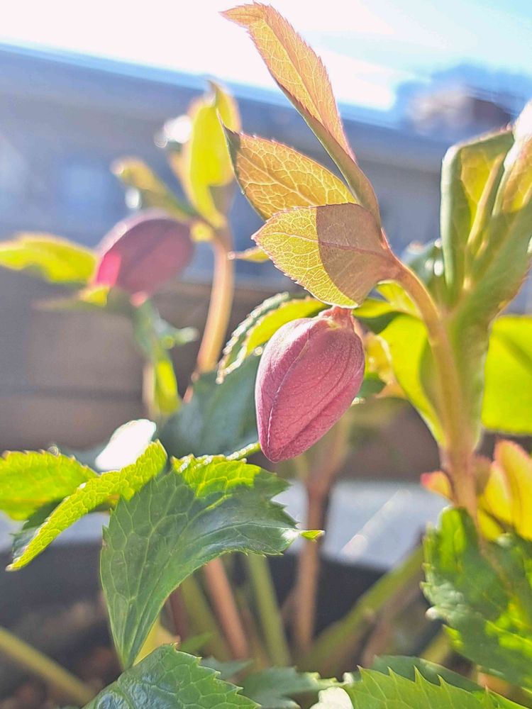 のんびり屋さんのクリスマスローズが少しずつ咲き始めてます。まだ蕾が上がってこない鉢が2つ。
